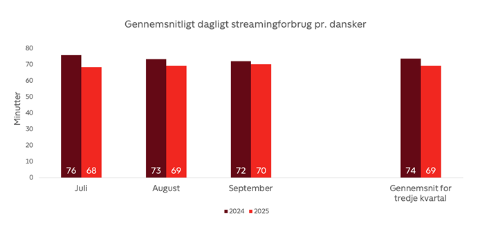 I tredje kvartal 2025 bruger hver dansker i gennemsnit 1 time og 9 minutter dagligt på at streame indhold. Det er færre minutter end sidste år, hvor den store sportssommer blandt andet var med til at trække niveauet op til en foreløbig rekord for tredje kvartal.