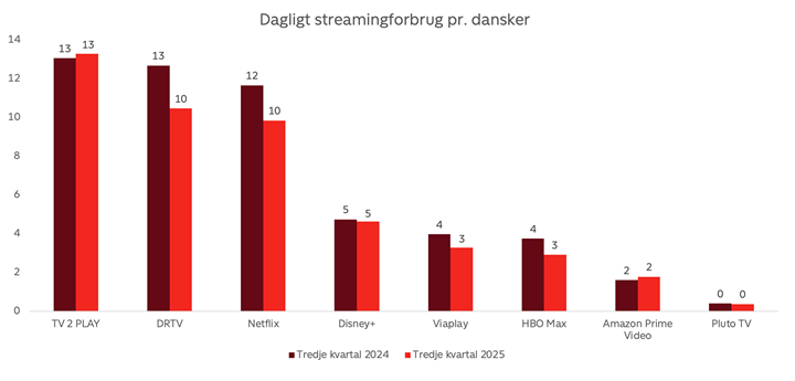 TV 2 Play er fortsat markedets største streamingtjeneste, og hver dansker bruger i gennemsnit 13 minutter dagligt på tjenesten. Det er på niveau med samme periode sidste år, og TV 2 Play er således én blandt få tjenester i markedet, der formår at opretholde niveau. Anderledes ser det ud hos DRTV og Netflix, der dagligt forbruges i 10 minutter hver, og som begge oplever tilbagegange siden samme periode sidste år. Også Viaplay og HBO Max oplever begge tilbagegang, mens Disney+ og Amazon Prime Video fastholder deres gennemsnitlige daglige minutter.