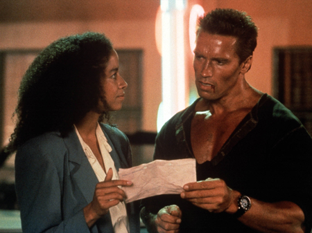 En bøf og en sild! Arnold Schwarzenegger som oberst Matrix og Rae Dawn Chong som stewardessen Cindy i actionfilmen "Commando".