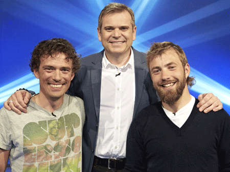 Bjarke og Thure - her sammen med quizvært Hans Pilgaard - har en helt speciel passion, og den koster mange penge. De dyrker nemlig ekstremsport og rejser verden rundt efter spænding og nye udfordringer.