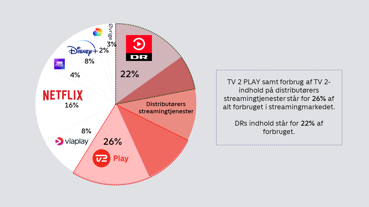 Som det kan ses i figuren nedenfor, udgør TV 2 Play samt forbrug af TV 2-indhold på distributørernes streamingtjenester 26 procent af forbruget i streamingmarkedet, mens DRTV og forbrug af DR’s indhold på distributørernes streamingtjenester udgør 22 procent af forbruget.