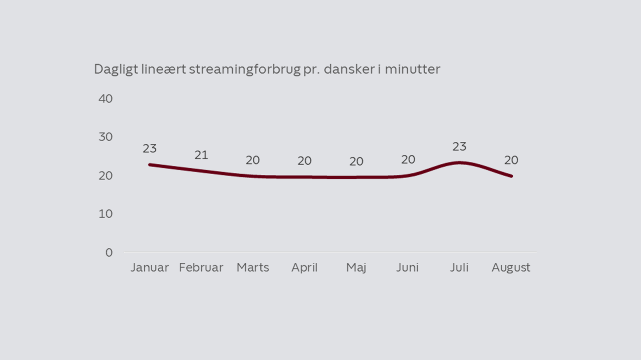 I de fleste måneder i første halvår 2023 bruger danskerne 20 minutter dagligt på lineær streaming på broadcasternes og distributørernes streamingtjenester, som er de tjenester, der tilbyder lineær streaming. Under de store sportsbegivenheder, og særligt dem med danske stjerner i fokus, stiger det lineære streamingforbrug i et omfang, hvor det også skubber til det samlede forbrug på streamingmarkedet.